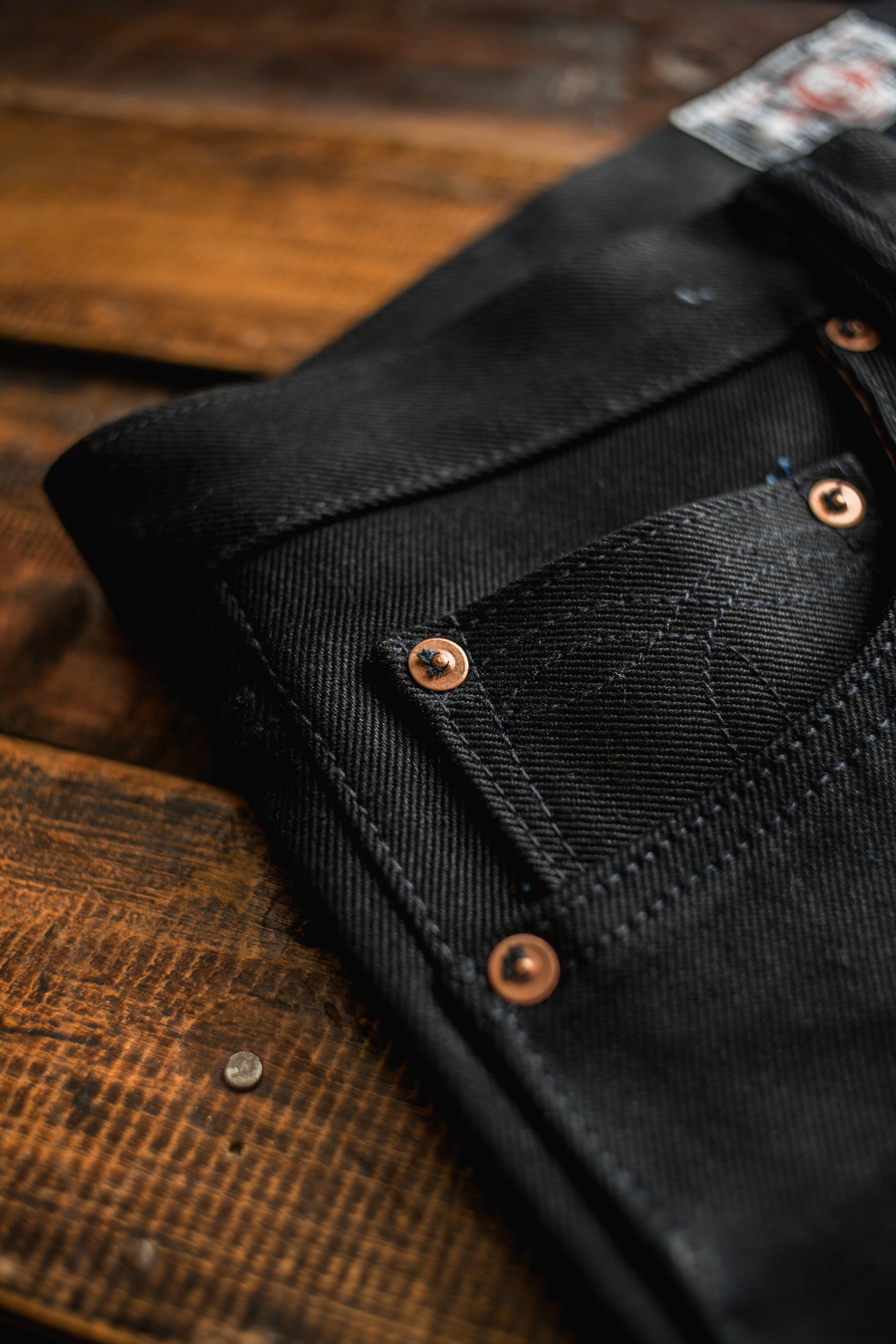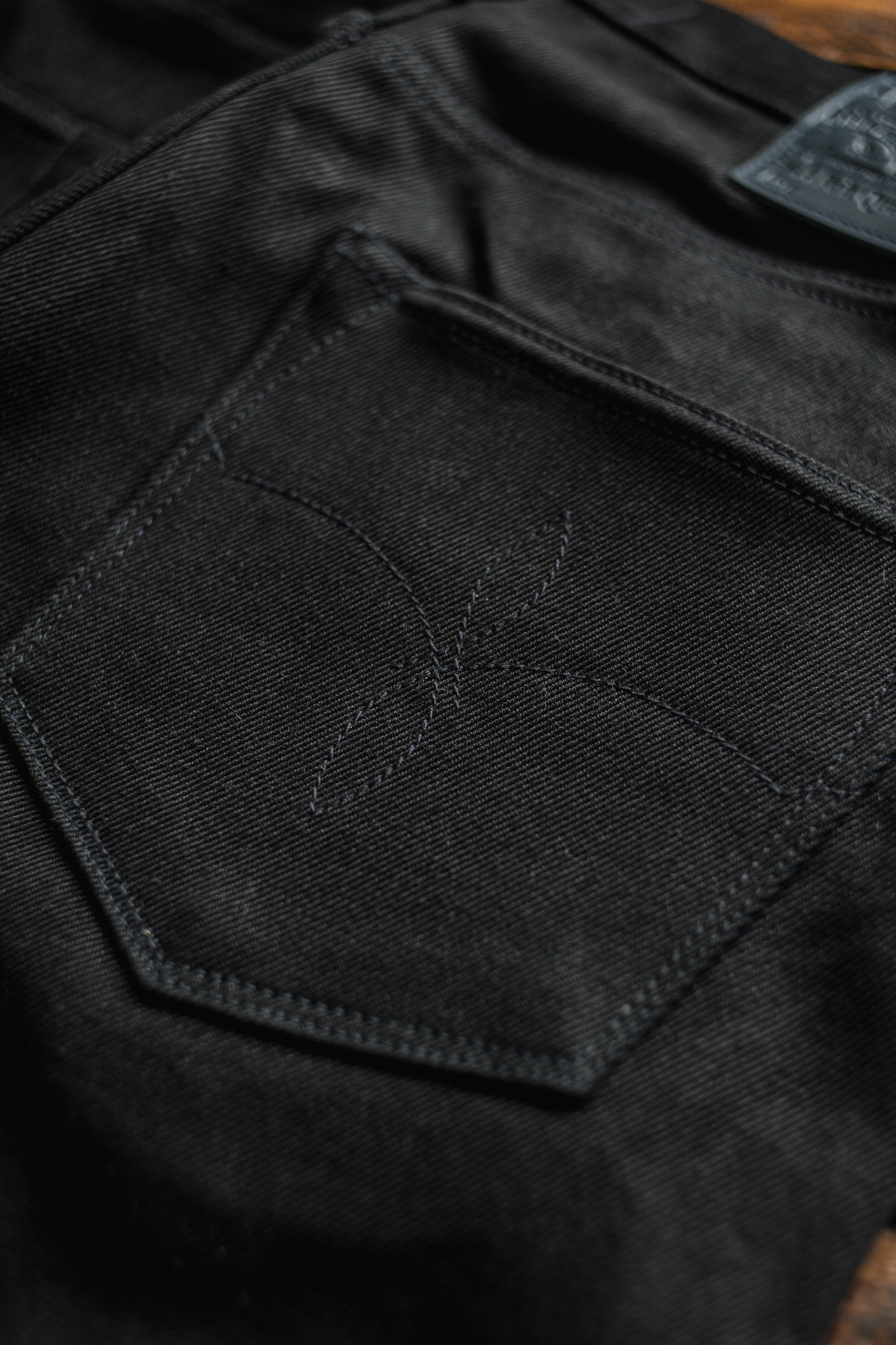 Born of a majestic black warp and indigo weft, this denim weaves a tale of mystery, depth, and contrast. The black threads hum like nightfall, while the indigo glimmers like fading sunlight on distant hills. Together, they create a texture and color that’s unique, alive, and constantly shifting, just like the Duskrider who roams the twilight trails.