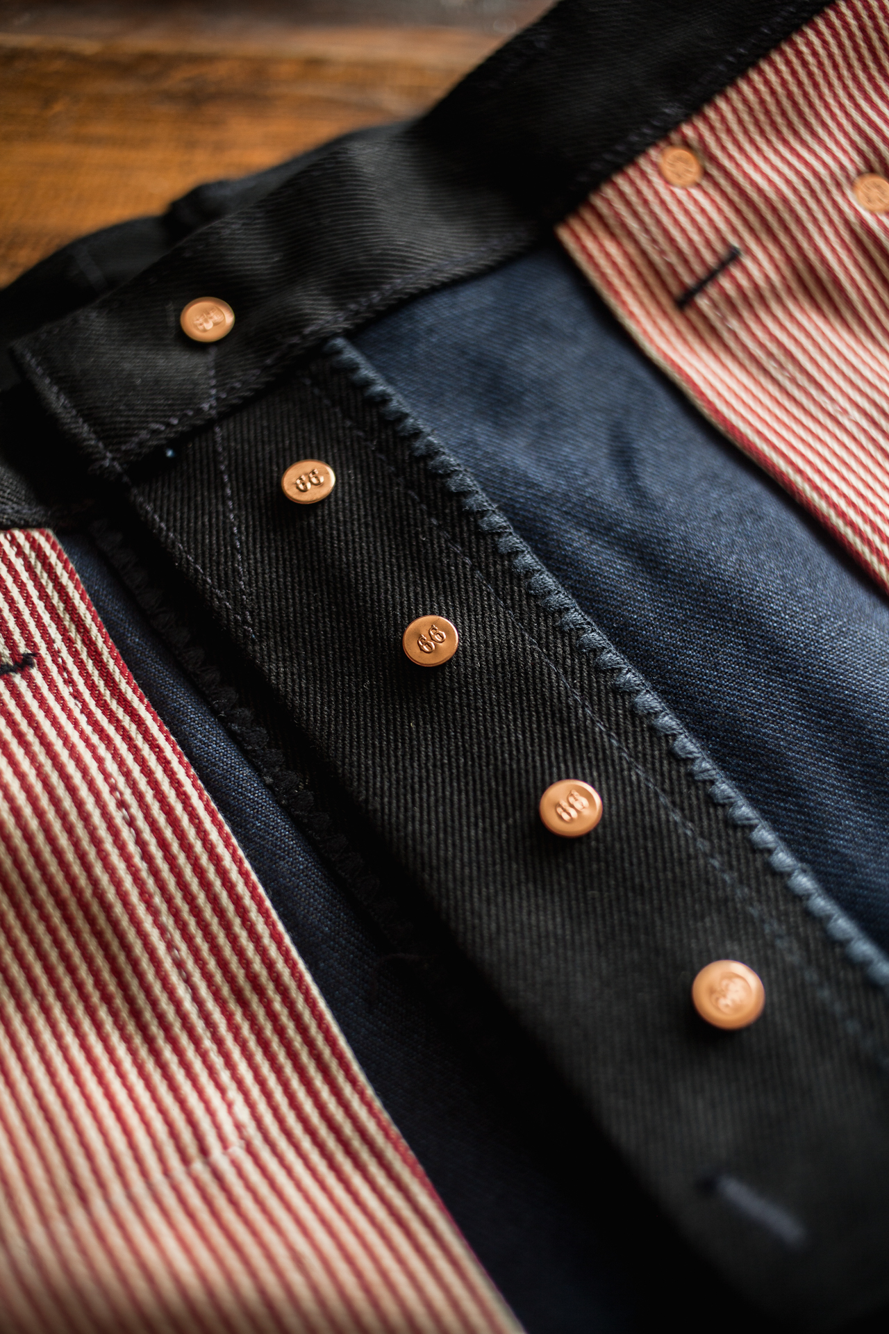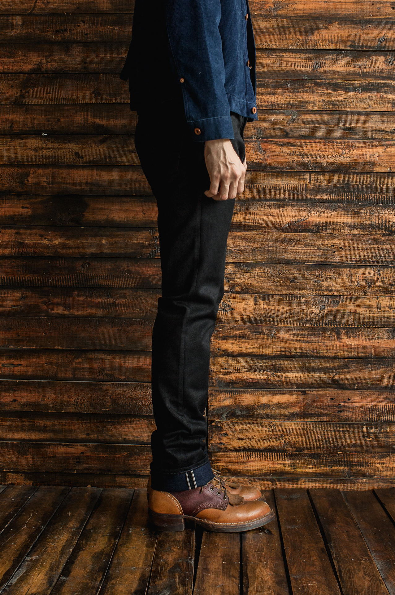 Weighing in at 18 oz/sq. yd., this mid-weight selvedge packs a real dusk-punch. The mix of black sulphur-dyed warp and indigo rope-dyed weft defines its character. To imagine how the black warp will fade out in the same timeline with the indigo weft; how the faded grey warp will showcase some hint of blue, is just something worth waiting and wearing for. A transformation as striking as the twilight itself.