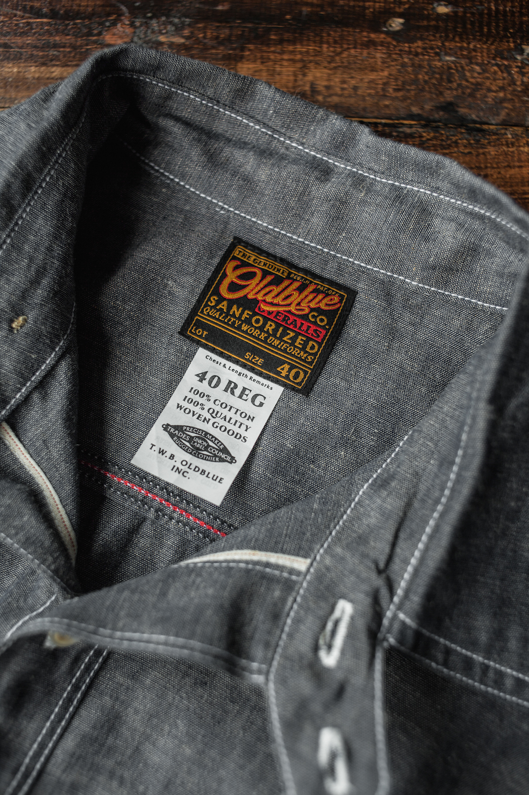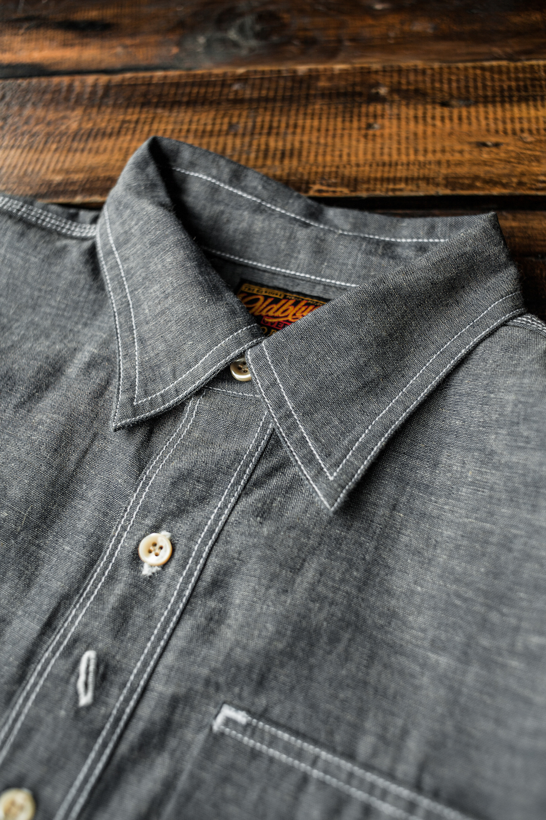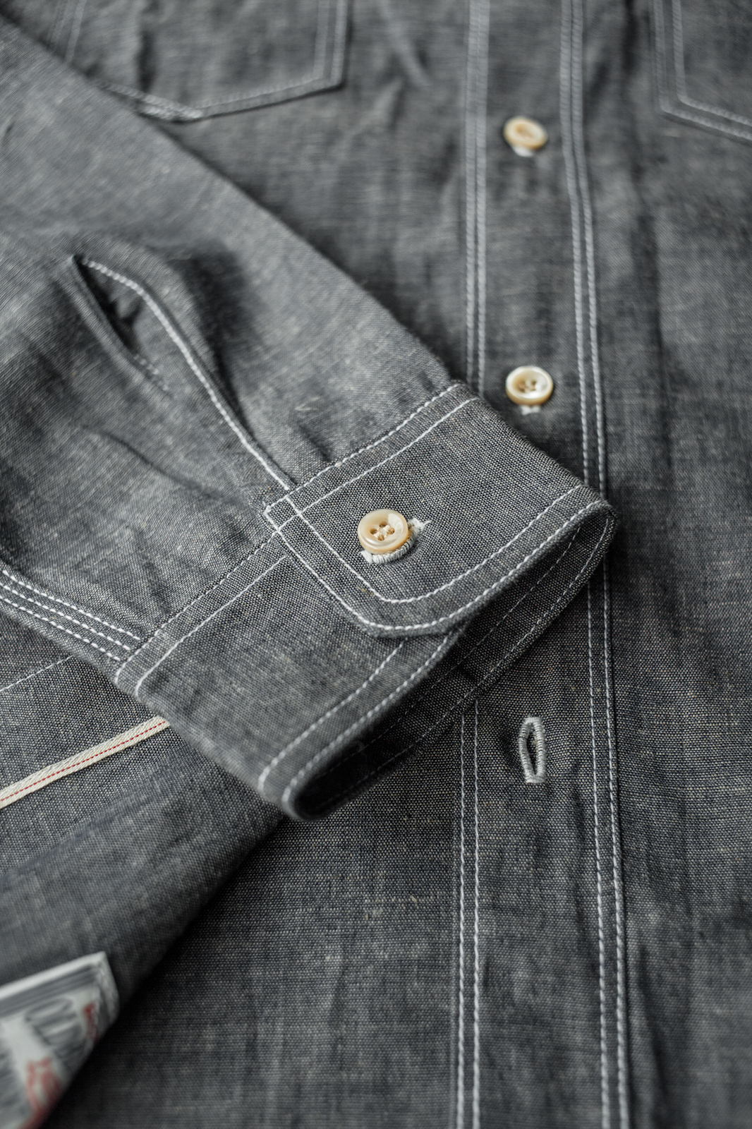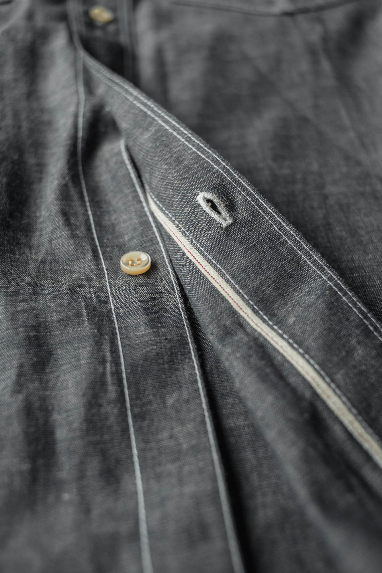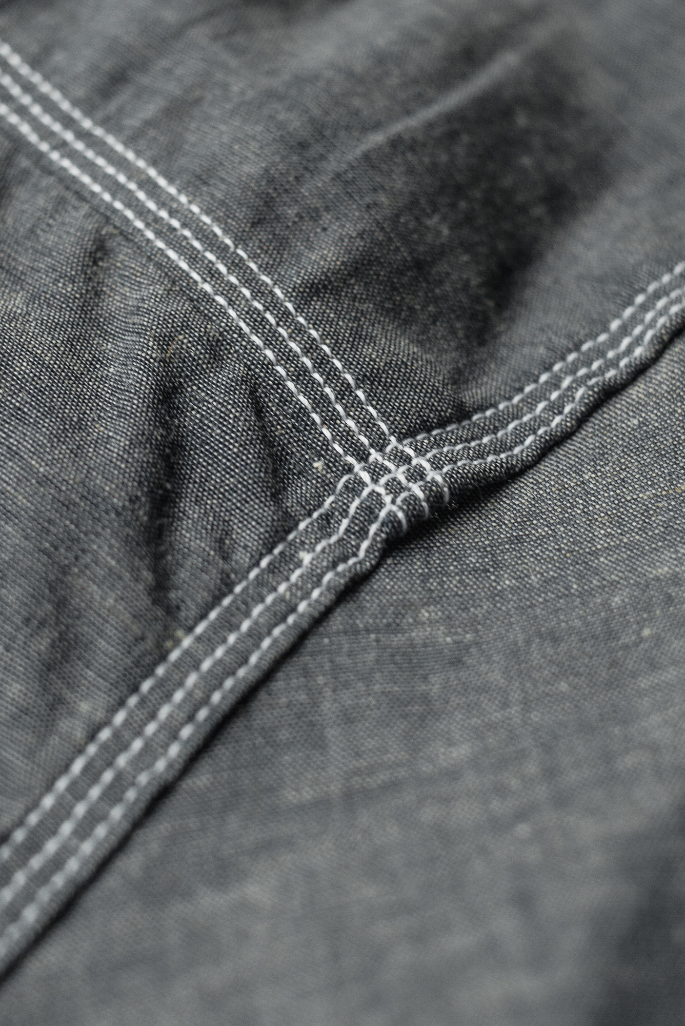 Chambray fabric is woven in a 1×1 plain weave construction. The particularity of chambray fabric comes from a colored warp yarn (indigo in this case) combined with a white or natural weft yarn. The white yarns running over the colored yarns give the fabric a certain depth. All of that, while maintaining a lighter weight. That’s one of the reasons why chambray fabric is so popular and widely used in the workwear realm. In a way that it offers the unique texture and appearance of denim, without the heft.