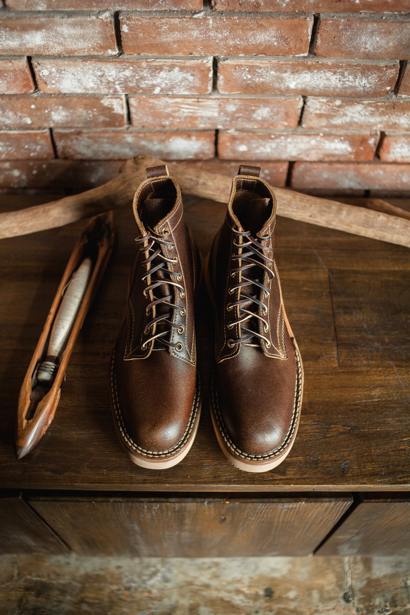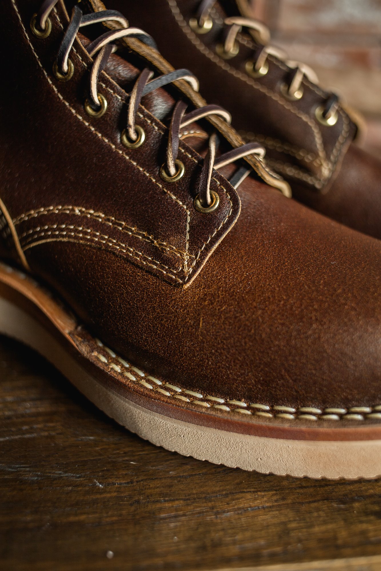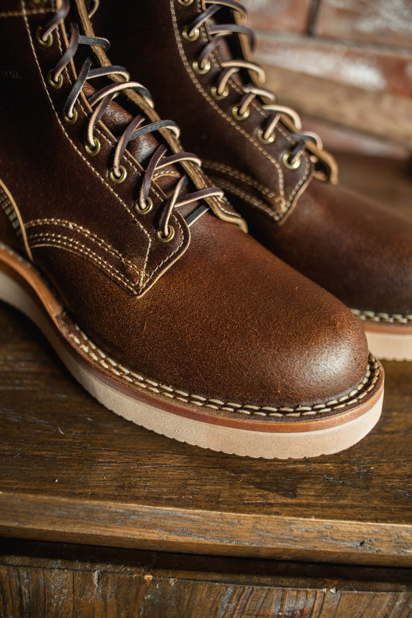 White’s stitchdown construction type offers a more secure fit and feel than a Goodyear Welted boot, but takes much less time to manufacture than their true hand-sewn stitchdowns. Still hand-lasted and hand-bottomed, the liner of our stitchdown boots is glued down to the bottom of the insole. Then the vamp is turned out, and the midsole and bottom are machine-stitched together through the vamp.