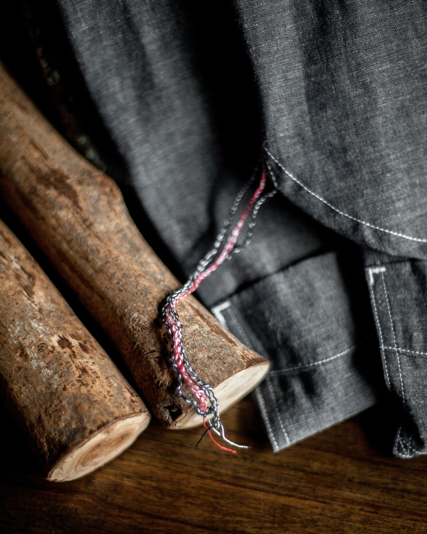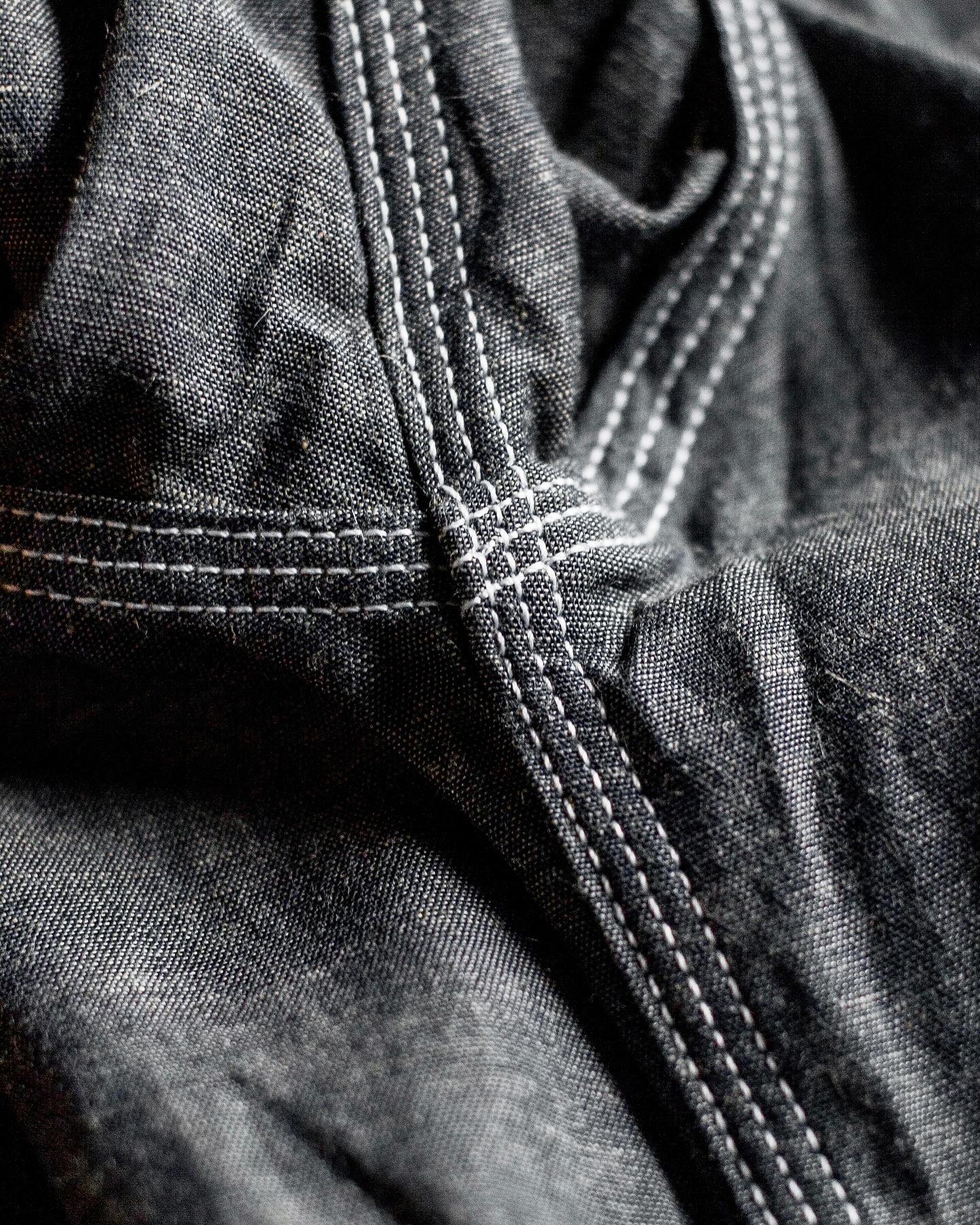 The weave? Plain and honest — a 1×1 setup where each indigo warp crosses a white weft, over and over. The white yarns running over the colored yarns give the fabric a certain depth. All of that, while maintaining a lighter weight.