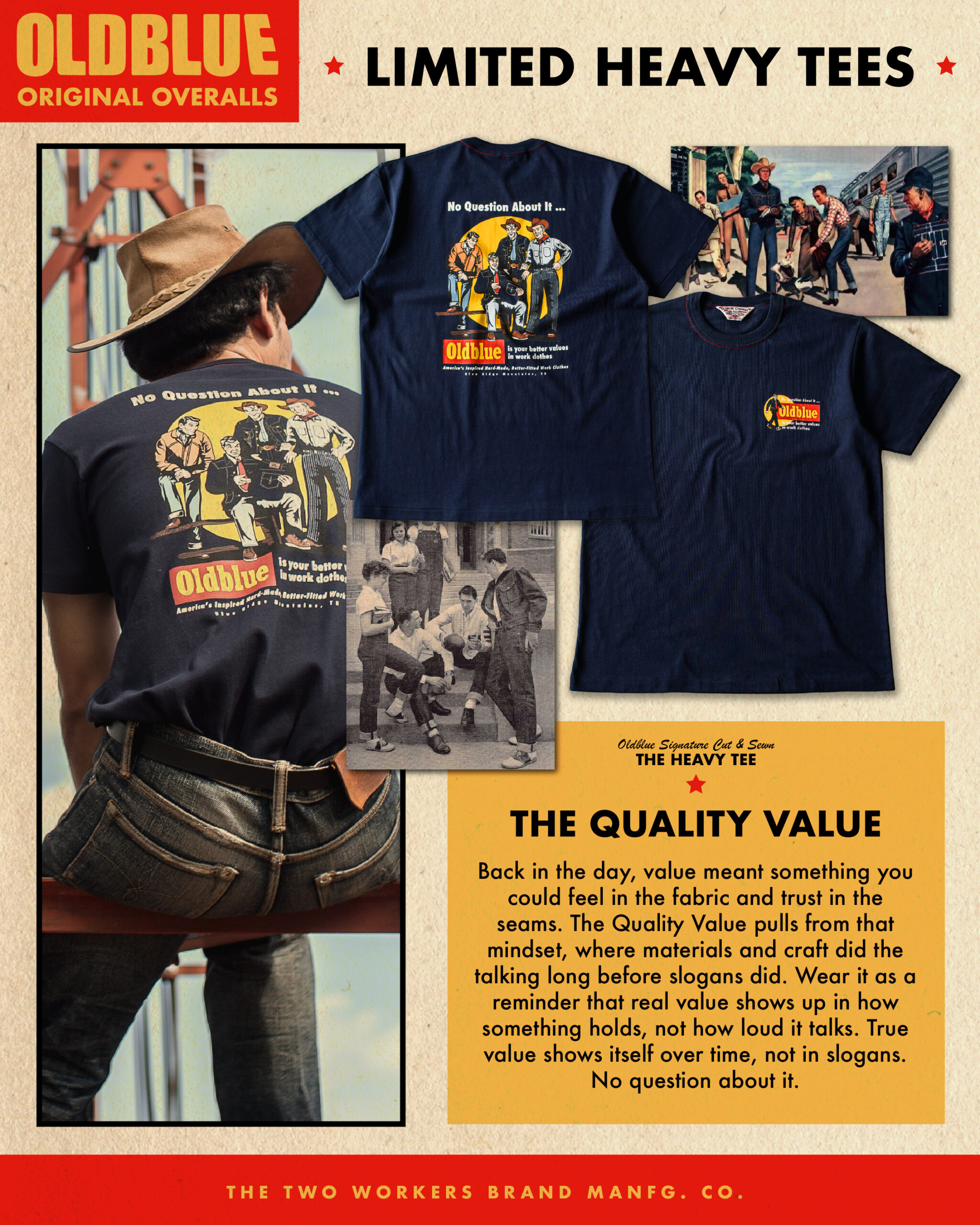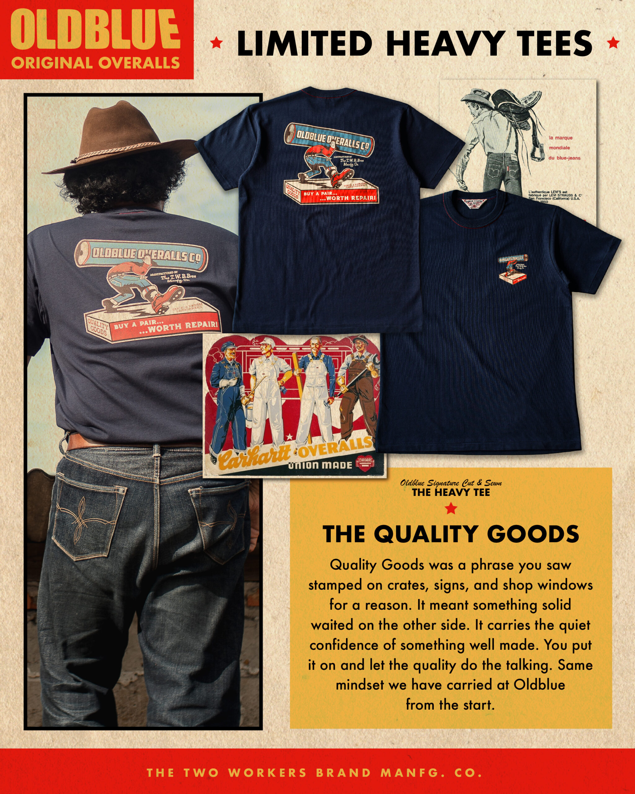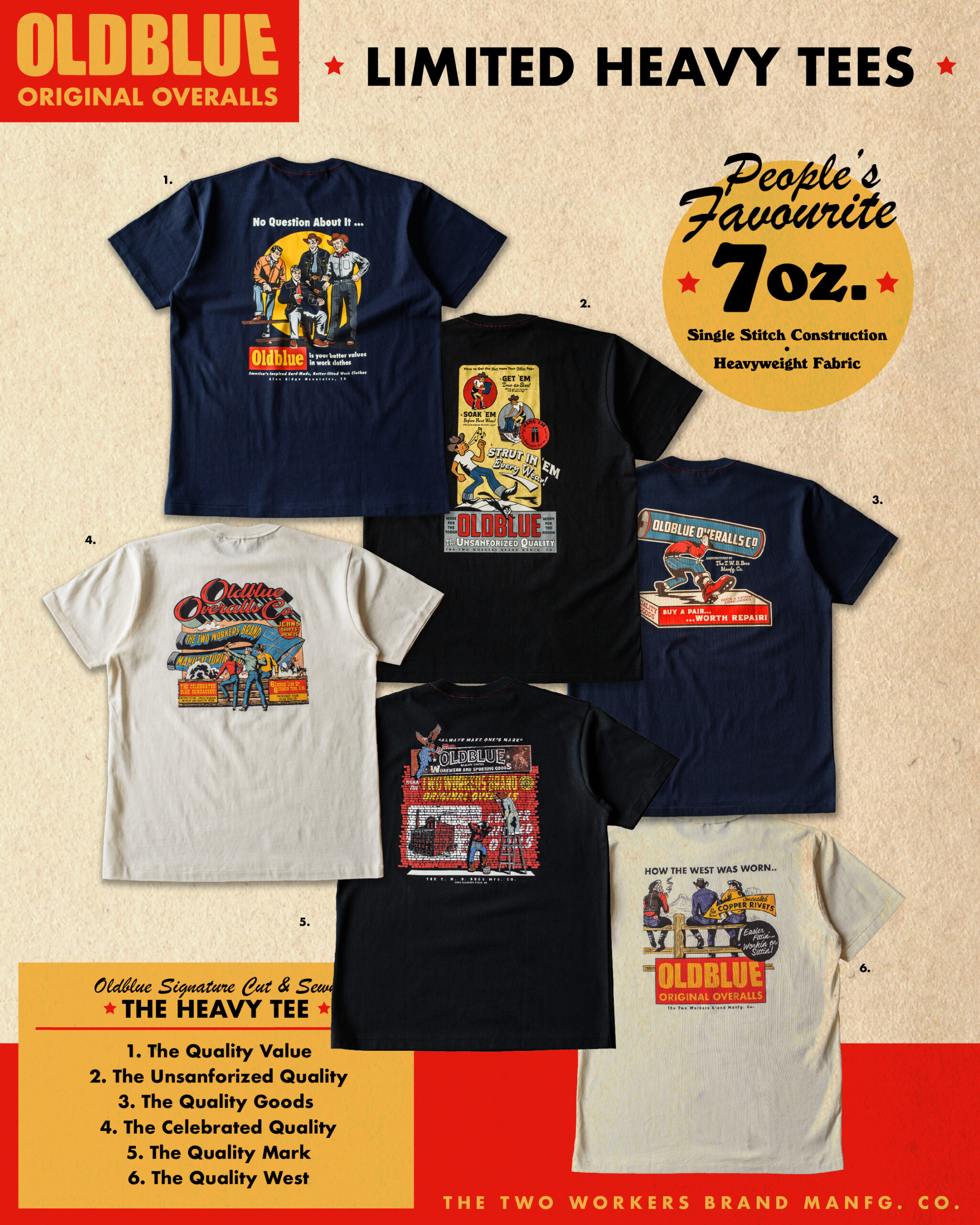 The current run of Oldblue Heavy T’s collection are available in 6 different articles. They are: The Quality Value, The Unsanforized Quality, The Celebrated Quality, The Quality Goods, The Quality West , and The Quality Mark.