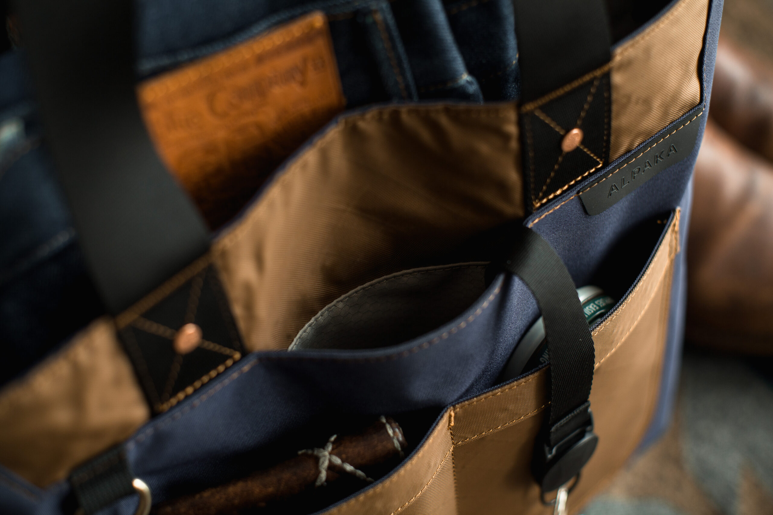 To carry that spirit forward, the Field Tote pairs Alpaka’s Axoflux 300D fabric in deep navy with the distinctive EPX 400D fabric in desert brown. The result is a carry that feels rugged at first glance yet refined in its presence.